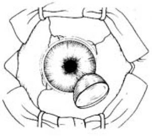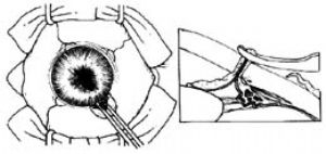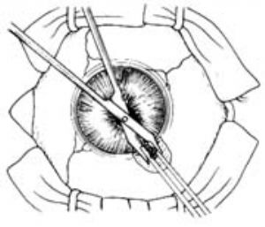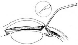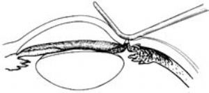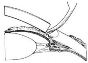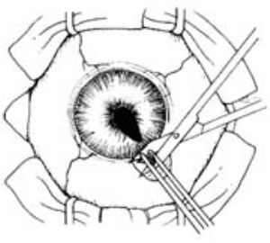 2.准备进行虹膜切除处有周边部虹膜前粘连,阻碍虹膜脱出。可将一钝头的睫状体剥离器伸入角巩膜切口一侧,一方面使剥离器对巩膜侧有一向下压力,另一方面使最周边角膜有一向上压力,直至少量房水溢出。然后快速地将剥离器滑向角巩膜切口另一侧,并快速地撤出伤口。此时周边部虹膜即可脱出。如果上述处理中,房水溢出过多,虹膜就很难脱出。