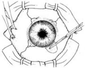 术前必须检查前房角。术前数天滴用广谱抗生素眼药水。术前1~2小时滴用2%毛果芸香碱眼药水,防止术中瞳孔扩大,有利于完成手术。对精神紧张者,术前一天晚上和术前2小时给于少量巴比妥类药物(如鲁米那0.06~0.1g)。