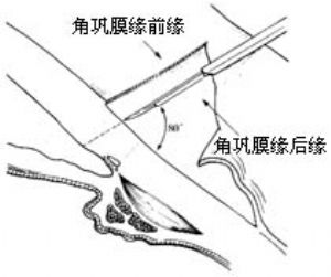 用剃须刀片或15号小圆刀片在角巩膜缘灰蓝半月区中间做平行于角巩膜缘切口。刀尖指向眼球中心稍前部,使刀呈接近垂直于角膜方向(约80°角)进入前房(图4)。