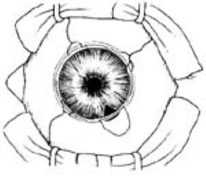 3.角巩膜缘切口 用镊子夹住一条水平直肌止端,以便充分地固定眼球(图3)。