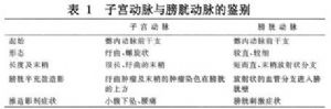 膀胱损伤可出现血尿、膀胱溃疡、尿潴留,经留置导尿和抗感染处理可恢复。若损伤输尿管则出现肾积水,少尿,需外科手术治疗。故开展该技术应熟练掌握导管技术,熟悉盆部各脏器的血管解剖,盆部各脏器的血管造影表现,特别注意子宫动脉与膀胱动脉的鉴别(表1)。子宫动脉是否与膀胱动脉共干,若有共干要尽量避开膀胱动脉,最好在DSA设备下开展工作,并发症是可以避免的。