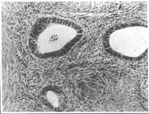 二、间质性子宫内膜异位症 为内在性子宫内膜异位症的一种特殊类型,较少见,即异位的内膜仅有内膜间质组织,或子宫内膜侵入肌层后间质组织发展的范围及程度远远超过腺体成分(照片3)。一般子宫一致性增大,异位细胞散布于肌层或集中在某一区域,色黄,常具有弹性橡皮样硬度,较肌瘤软,在切面往往可以看到索状小虫样突起,就可据以确立诊断。异位组织亦可向宫腔发展形成息肉状肿块,多发性,表面光滑,蒂宽与子宫肌壁有较大面积的直接连系,并可由宫壁向宫腔或沿子宫血管向阔韧带内突出。向宫腔突出者致成月经过多甚或绝经后流血;向阔韧带突出者可经妇科双合诊查出。间质性子宫内膜异位症可有肺播散,甚至在切除子宫数年后还能发生。由于这种特点,有人认为间质性子宫内膜异位症是低底恶性的肉瘤。
