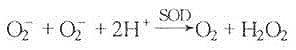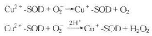 SOD是催化O2-歧化反应的酶类,这种歧化反应属于自身氧化还原反应,O2-的歧化反应在H-存在下,经SOD催化,一半O2-氧化为O2,O2-的另一半还原为O22-。