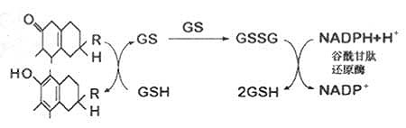 维生素E又名生育酚,天然的生育酚有七种,其中分布最广泛的是α-生育粉,具有抗氧化作用。维生素E可抑制肝细胞内微粒体的过氧化脂类的生成。据报道,给予鼠维生素E有延长寿命的作用,在胎儿成纤维细胞传代培养中,给予维生素E者,传代数增加,可抑制过氧化脂类生成,其原因是作为生物体内自由基淬灭自由基(LOO·)生成的苯羟自由基的过程可被巯基化合物还原,特别是被GSH还原成生育酚,从而使生育酚能更有效的发挥作用。