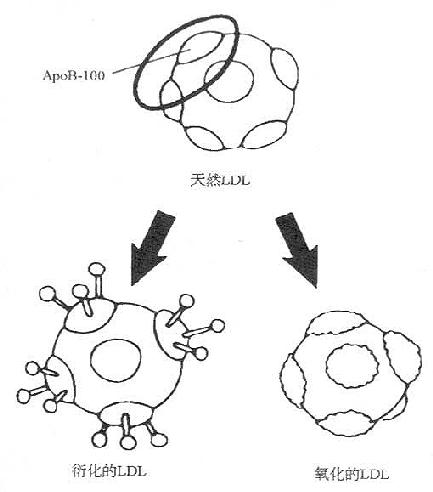 氧化的LDL是修饰LDL中的一类。修饰的LDL除包括氧化修饰的LDL外,还包括乙酰化LDL及丙二醛、4-羟烯酸直接结合的LDL,我们称这些未经氧化修饰,而仅经一般化学修饰的LDL为衍化的LDL。