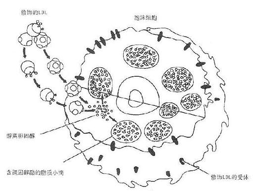 在早期的动脉粥样硬化损伤中,发现负荷脂质的泡沫细胞在动脉内膜下集聚。这些泡沫细胞主要来源于摄取OxLDL的单核/巨噬细胞。内皮下泡沫细胞的堆积在动脉粥硬化起因中有关键作用。