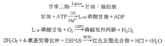 血清中甘油三酯经脂肪酶水解为甘油和脂肪酸,甘油在甘油激酶(GK)及ATP存在下,生成3-磷酸甘油,尔后,在磷酸甘油氧化酶(GPO)作用氧化成磷酸二羟丙酮并生成H2O2,H2O2与底物4-氨基安替比林和ESPAS在过氧化物酶(POD)作用下,生成红色亚醌化合物(quinoneimine),比色(500nm),其颜色深浅与甘油三酯含量成正比。