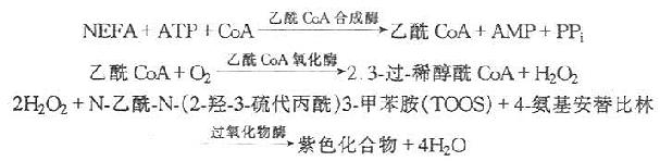 血清中游离脂肪酸或非酯化脂肪酸(NEFA),经酶试剂作用生成紫色化合物,其颜色深浅与NEFA含量成正比。
