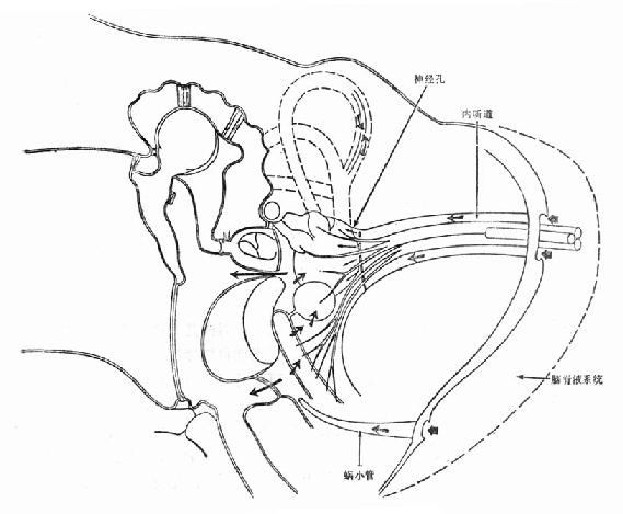 1.外爆途径(图99-1)脑脊液压力增高,蜗小管和内听道的筛孔将此压力改变传递到外淋巴系统,其中蜗小管可能起主要作用。在正常情况下蜗小管内存在网状绒毛及屏障膜,使脑脊液与外淋巴间不能畅通无阻。