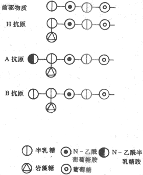 细胞膜所含糖类甚少,主要是一些寡糖和多糖链,它们都以共价键的形式和膜脂质或蛋白质结合,形成糖脂和糖蛋白;这些糖链绝大多数是裸露在膜的外面一侧的。这些糖链的意义之一在于以其单糖排列顺序上的特异性,可以作为它们所结合的蛋白质的特异性的“标志”。例如,有些糖链可以作为抗原决定簇,表示某种免疫信息;有些是作为膜受体的“可识别性”部分,能特异地与某种递质、激素或其他化学信号分子相结合。如人的红细胞ABO血型系统中,红细胞的不同抗原特性就是由结合在膜脂质的鞘氨醇分子上的寡糖链所决定的,A型抗原和B型抗原的差别仅在于此糖链中一个糖基的不同。由此可见,生物体内不仅是多聚糖核苷酸中的碱基排列和肽链中氨基酸的排列可以起“分子语言”的作用,而且有些糖类物质中所含糖基序列的不同也可起类似的作用。