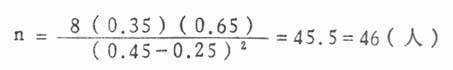 我们运用前面学过的某些假设检验公式,就可以进行样本含量的计算。下面仅举两例略作介绍。这里的公式仅适用于α=0.05,1—β=0.50。而且都是双侧检验。