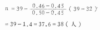 本例X1=2.6,X2=2.0,S=1.3,故δ=(μ1-μ2)/σ=(2.6-2.0)/1.3=0.46。若设α=0.05,1—β=0.50,用双侧检验,查附表21,δ=0.46查不到。在这种情况下,可用邻近而略小的δ值代替,或用内插法估计。本例若查δ=0.45,得n=39,即每组需要39例,两组共需78例。若用内插法计算,当δ=0.45时所需例数是39,δ=0.50时所需例数是32,所以δ=0.46时所需例数是: