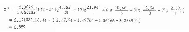在表8.5的下部最末一行我们已将各组离均差平方和及其合计列出,只要分别除以各自的自由度即为各组方差及合并方差Sc2,然后代入式8.12便可求得χ2