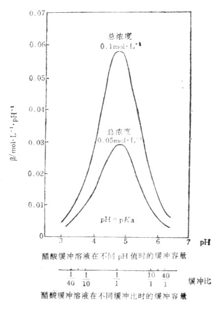 如图3-1所示,对任何一种缓冲溶液的每一个PH值,都有其相应的缓冲量。缓冲容量实际上是一个微分比,可定义为:使1升缓冲溶液的PH值增高很小一个数值dPH时,需加入的强碱物质的量为db,则db与dPH之比值叫缓冲容量,用数学式表示为β=db/dPH缓冲mol·L-1·PH-1。如总浓度(即共轭酸与共轭碱浓度之和)为0.100mol·L-1PH4.45的HOAc-NaOAc缓冲溶液(即醋酸缓冲溶液)的缓冲容量为0.051(mol·L-1·PH-1)。