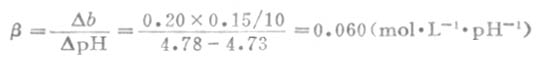 在实际工作中,我们可以通过测量加入强碱的增量Δb(或加入强酸,相对于减少强碱量-Δb),同时测量相应的PH值的增量ΔPH(或加入强酸,PH减小,-ΔPH),从两者比值求得β。因此缓冲容量在数值上等于使1毫升缓冲溶液的PH值改变1个单位时所必须加入的强碱或强酸的物质的量(通常单位用毫摩)。