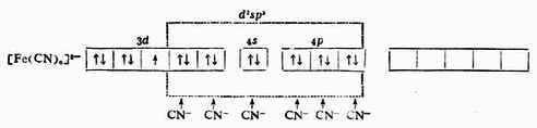 [Fe(CN)6]3-配离子中的Fe 3+在配位体CN-的影响下,把原来分布在5个3d轨道上的5个未成对电子挤到3个3d轨道上,空出2个3d轨道与外层的1个4s轨道和3个4p轨道杂化成6个等价的d2sp3杂化轨道与6个配位体CN-成键,形成的[Fe(CN)6]3-配离子属内轨型。在与离子中只有1个未成对电子,故它的磁性比Fe 3+的磁性小,它的外层电子结构为: