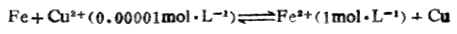 1,表明Cu2+是比Fe2+更强的氧化剂,Fe是比Cu更强的还原剂所以上述反应可自发地向右进行。