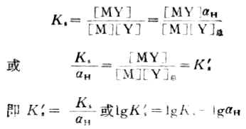 式中Ks'是考虑了酸效应的稳定常数,叫做条件稳定常数或表观稳定常数,在不同酸度下,KS是不变的,但由于aH随酸度增大而增大,故Ks'则随酸度的增大而减小。在配合滴定中,要求反应量的完成,Ks'越大,反应进行得越完全。