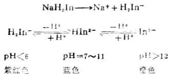 常见的金属指示剂有铬黑T(EBT)、钙试剂等。现以铬黑T为例进行介绍。铬黑T(用NaH2In表示)是一个具有弱酸性酚羟基的有色配合剂,在不同的酸度下为不同的颜色。
