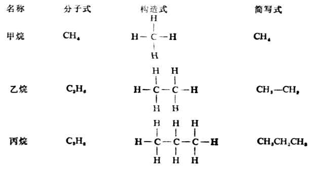 烷烃的构造特点是其中的碳原子与碳原子都以单键相结合,其余价键都和氢原子相连接,含有一个、两个和三个碳原子的烷烃构造如下;