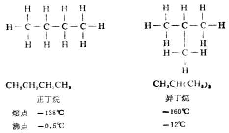 一种物质只能有一种特定的构造。因此,要了解有机物的特性和反应,常常要研究它们的构造。在研究烷烃的同系列时,发现随着碳原子数的逐渐增加,会出现同分异构现象。例如:分子式为C4H10的烷烃,碳原子的连结方式有两种可能,其构造式分别为: