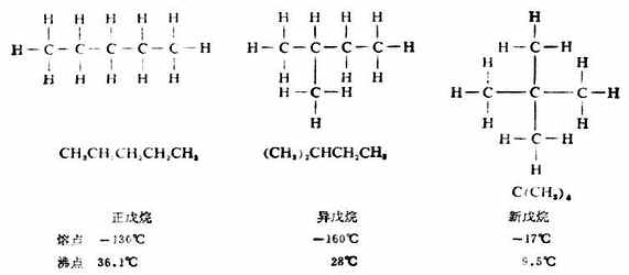 分子式为C5H12的烷烃,碳原子的连结方式则有三种可能,其构造式分别为: