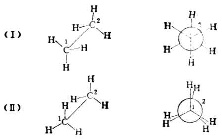 不同的构象可用透视式或纽曼投影式表示。(Ⅰ)和(Ⅱ)是乙烷的两种典型构象。
