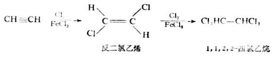 炔烃能与氯或溴加成。反应分两步进行,第一次加1mol试剂,生成烯烃的二卤衍生物;第二次再加1mol试剂,生成四卤代烷。例如: