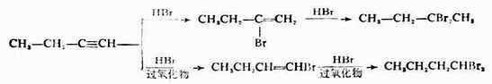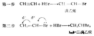 炔烃和卤化氢的加成反应也是分两步进行的。