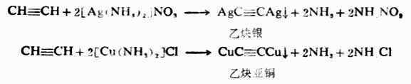 上述反应极为灵敏,常用来鉴定具有-C≡CH构造特征的炔烃,并可利用这一反应从混合物中把这种炔烃分离出来。而R`-C≡C-R型的炔烃不发生这两个反应。乙炔银和乙炔亚铜在湿润时比较稳定,在干燥时能因撞击或升高温度发生爆炸,所以实验完毕后,应立即加硝酸把它分解掉。