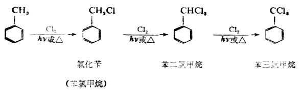 如果不用催化剂,而是在日光或加热的条件下甲苯与氯气反应,则取代不是发生在苯环上,而是发生在侧链上,即甲基上的氢逐个地被氧化(自由基取代)。