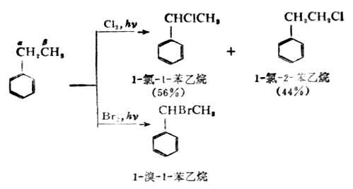 在光照下,乙苯与氯的反应得到一个混合物。一般说来,在进行自由基卤代时,α-H比β-H容易被取代。乙苯与溴在日光下反应时,α-溴乙苯几乎是唯一产物,表明了自由基溴代时,溴对不同氢原子取代的选择性。