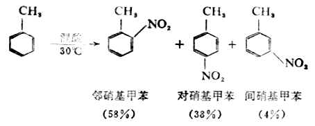 如果反应温度为50℃时,邻及对硝基甲苯继续硝化,主要得2,4-二硝基甲苯,后者在100℃时进一步反应,生成2,4,6-三硝基甲苯(INT),它是一种重要的炸药。