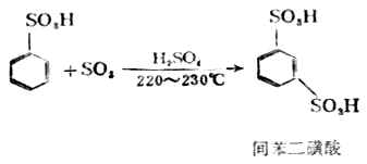 苯磺酸继续磺化时,需要用发烟硫酸及较高温度,产生主要为间苯二磺酸。可见,苯环上已有了磺基后,再引入第二个磺基时比苯要难,而且第二个磺基主要进入原来磺基的间位。