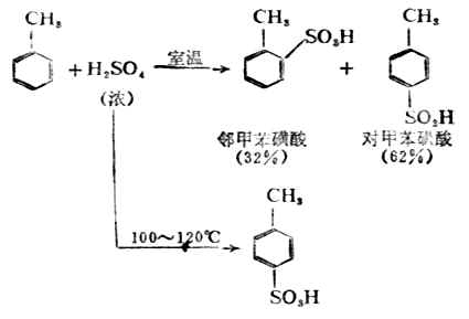 苯的同系物的磺化反应比苯容易进行。例如,甲苯与浓硫酸在常温下即可发发生碘化反应,主要产生是邻及对苯磺酸。如在100-120℃时反应,则对甲苯酸为主要产生。