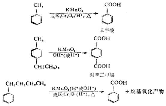苯环本身很稳定,在一般情况下难以氧化。苯的同系物则能与一些氧化剂(如重铬酸钾的酸性溶液、高锰酸钾溶液)反应。这时,苯环的侧链被氧化,只要侧链上有α-H,无论侧链烷基长短如何,都被氧化为与苯相连的羧基。