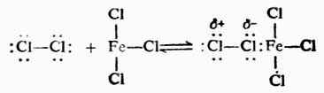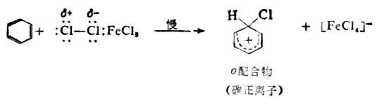 苯与卤素在催化剂(例如FeCL3)存在下的卤化,是由亲电试剂发动进攻的。这个反应的亲电试剂与卤化铁生成的配合物。
