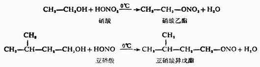 醇可与无机含氧酸如硝酸、亚硝酸β硫酸和磷酸等作用,失去一分子水而生成无机酸酯。例如: