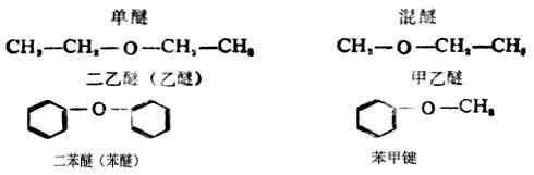 简单的醚。采用与氧原子相连的两上烃基的名称来命名。单醚就先写出烃基的名称,省略“二”字,然后加上“醚”字即可。混合醚的名称中,较小的烃基名称放在前面;如果有一个烃基是链状的,另一个是芳香烃基时,则把芳香烃基名称放在前面。例如: