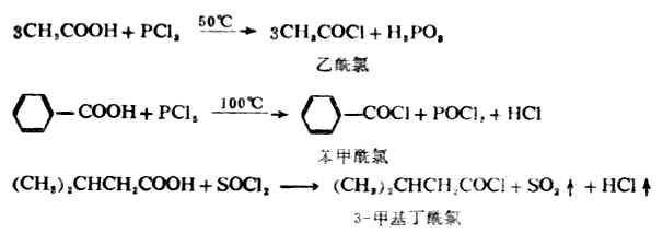 羧酸(除甲酸外)能与三卤化磷、五卤化磷或亚硫酰氯(SOCL2)反应,羧基中的羟基被卤素取代生成相应的酰卤。
