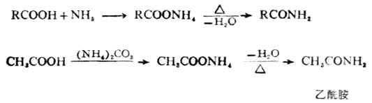 在羧酸中通入氨气或加入碳酸铵,可以得到羧酸的铵盐。将固体的羧酸铵加热,分子内失去一分子水生成酰胺。