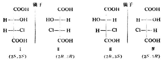 含两个或两个以上手性碳的分子中,每个手性碳的构型都须用R/S标示,写在化合物名称之前,并标以该手性碳的位次。例如,Ⅰ为(2S,3S)-2-羟基-3-氯丁二酸。
