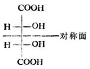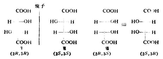 Ⅴ与Ⅵ是一对对映体。Ⅶ的两个费歇尔投影式是等同的。因为将任何一个在纸平面上旋转180°即得另一个。Ⅶ虽有两个手性碳原子,却不具旋光性。这是由于这个分子是对称的,它有一个对称面,即垂直于C(2)-C(3)键的平面。这种异构体叫做内消旋体,用meso-或i-表示。