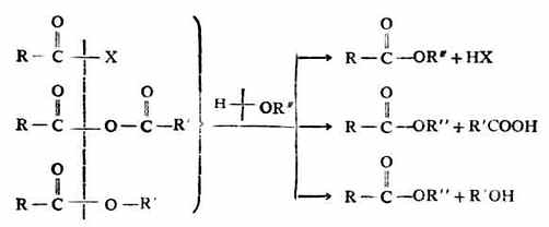 酰卤,酸酐和羧酸酯与醇反应均有羧酸酯生成,其中,羧酸酯的醇解是可逆反应,须在催化剂存在下进行。这个反应是从一种羧酸酯转变成另一种羧酸酯。因此又叫酯交换。例如: