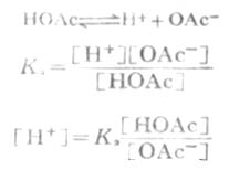 HOAc的离解度比较小,由于溶液中大量的OAc-对HOAc所产生的同离子效应,使HOAc的离解度变得更小。因此上式中的[HOAc]可以看作等于HOAc的总浓度[共轭酸](即缓冲溶液中共轭酸的浓度)。同时,在溶液中NaOAc全部离解,可以认为溶液中[OAc-]等于NaOAc的总浓度[共轭碱](即配制的缓冲溶液中共轭碱的浓度)。将[共轭酸]和[共轭碱]代入上式,则得