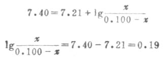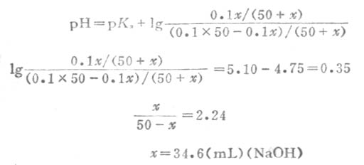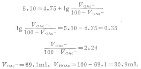 例11 欲配制pH值为5.10的缓冲溶液,计算在50mL的0.1ml.L-1HOAc溶液中应加0.1mol.L-1NaOH溶液多少mL?