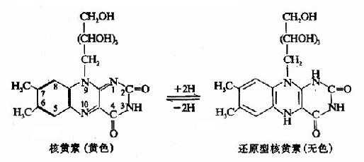 维生素B2分子中的异咯嗪,其第1和第10位氮原子可反复接受和放出氢,因而具有可逆的氧化还原特性,这一特点与它的主要生理功能相关。