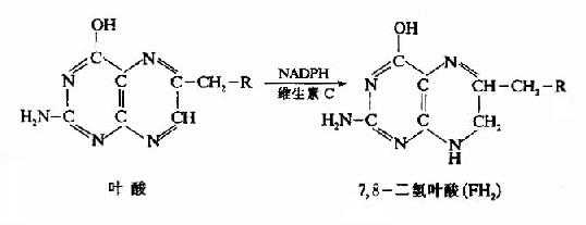 叶酸在体内必须转变成四氢叶酸(FH4或THFA)才有生理活性。小肠粘膜、肝及骨髓等组织含有叶酸还原酶,在NADPH和维生素C的参与下,可催化此种转变。