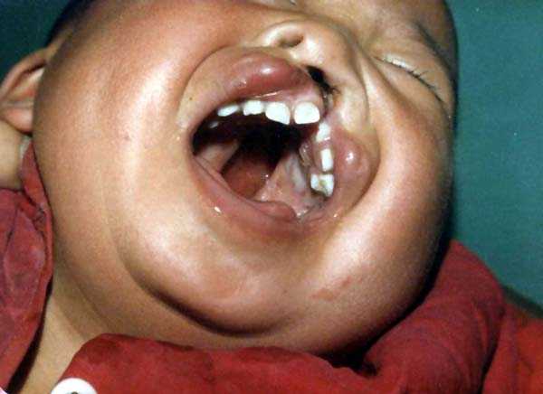 。兔唇的形象为:上颚严重开裂,上唇缺失,牙颌畸形。