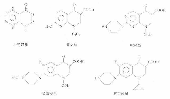 萘啶酸(nalidixicacid)是1962年用于临床的第一个喹诺酮类药(实是萘啶酮),抗菌谱窄,口服吸收差,副作用多,现已不用。吡哌酸(pipemidicacid)抗菌活性强于萘啶酸,口服少量吸收,不良反应较萘啶酸少,可用于敏感菌的尿路感染与肠道感染。1979年合成诺氟沙星(norfloxacin),随又合成一系列含氟的新喹诺酮类药,通称为氟喹诺酮类(fluoroquinolones)。